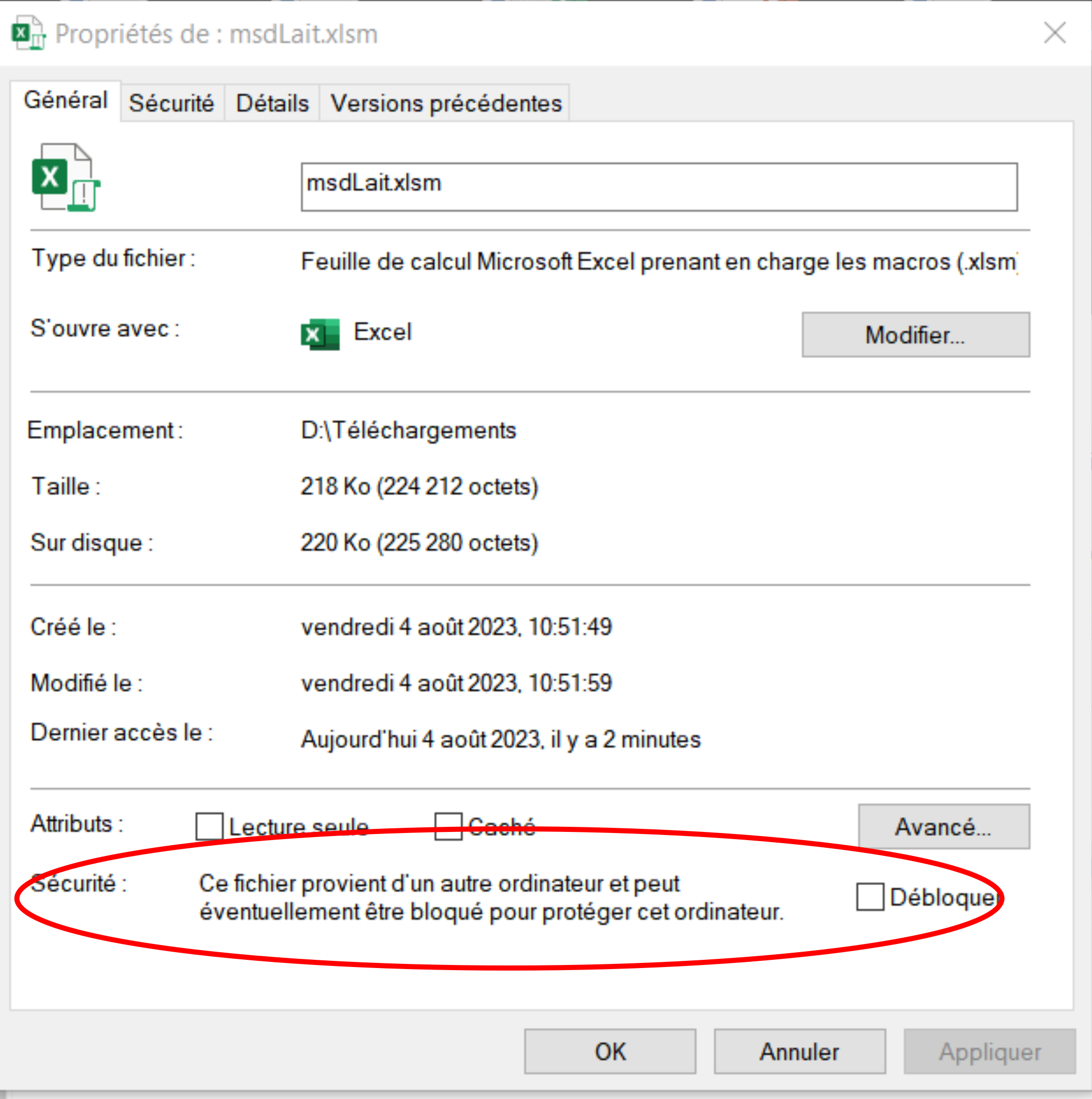Pour certains fichiers Excel avec macros, il faudra enregistrer le fichier, puis débloquer la sécurité dans les propriétés, voir image ci-dessous ...